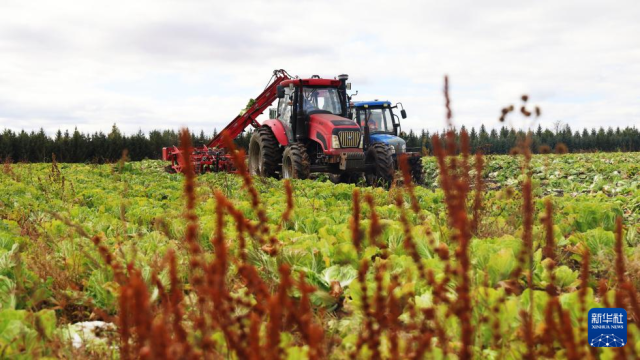 10月8日,在北大荒集团黑龙江红星农场第四管理区,农机在收获白菜。