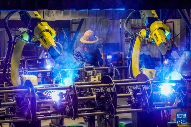 1月5日,在中铁科工集团武汉江夏制造基地,技术工人对门吊配件进行焊接作业。