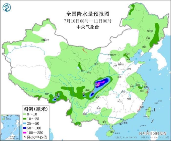 7月9日08时至10日08时,内蒙古东部、东北地区中南部、青海北部、甘肃南部、陕西南部、川西高原、四川盆地北部和西部、黄淮东部、江淮、江汉东部、江南东北部、西藏南部、云南西部和南部等地的部分地区有中到大雨,其中四川盆地西北部、甘肃东南部、陕西西南部、安徽东部、江苏南部、云南西南部等地局地暴雨或大暴雨(100~160毫米)。内蒙古中西部、江南东部等地的部分地区有4~6级风。