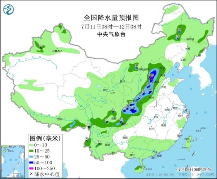 7月11日08时至12日08时,新疆伊犁河谷、内蒙古东部和河套地区、黑龙江南部、西北地区东南部、华北中南部、黄淮西部、江汉西部、四川盆地中东部和南部、川西高原南部、四川西南部、云南西部等地的部分地区有中到大雨,其中,陕西南部、山西东部和南部、河北西部、河南西北部、四川东北部、重庆北部等地的部分地区暴雨,局地大暴雨(100~200毫米)。