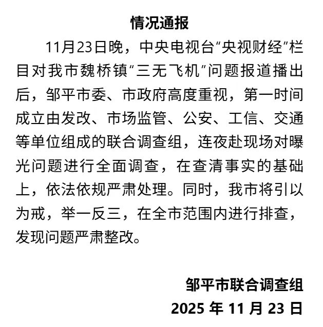 央视网消息:山东邹平市联合调查组发布情况通报:11月23日晚,中央电视台“央视财经”栏目对该市魏桥镇“三无飞机”问题报道播出后,邹平市委、市政府高度重视,第一时间成立由发改、市场监管、公安、工信、交通等单位组成的联合调查组,连夜赴现场对曝光问题进行全面调查,在查清事实的基础上,依法依规严肃处理。同时,邹平市将引以为戒,举一反三,在全市范围内进行排查,发现问题严肃整改。