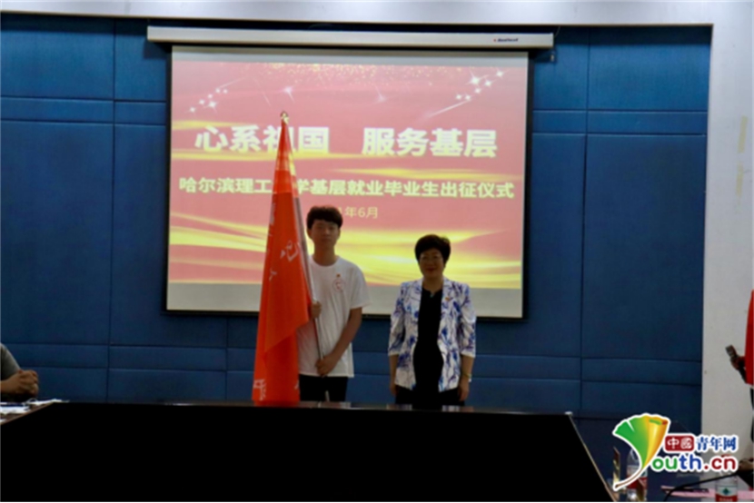 中国青年网哈尔滨6月24日电 6月21日,在哈尔滨理工大学举行的2021届“心系祖国 服务基层”出征仪式上,23名赴基层就业毕业生代表,从校党委副书记陆岩的手中郑重接过“心系祖国 服务基层”的旗帜。不久后,他们将作为研究生支教团代表、选调生代表、西部计划代表奔赴基层,到祖国最需要的地方去,开启人生新的篇章。