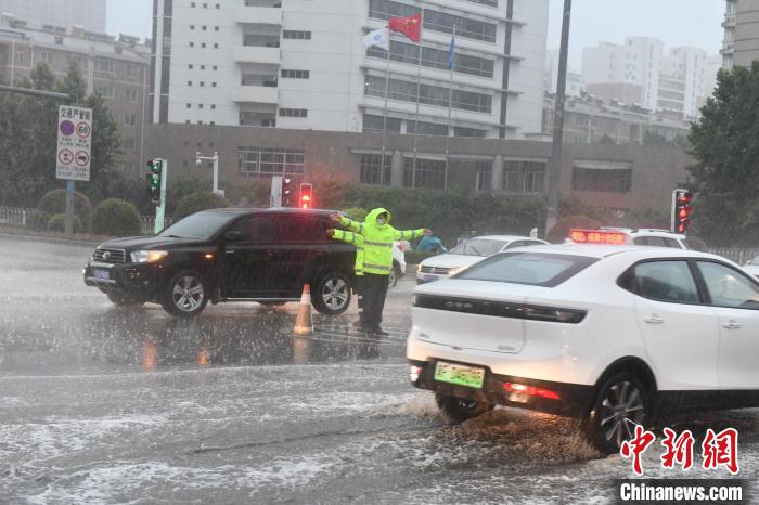 图为保定市公安交警在大雨中疏导交通。 保定市交警支队供图