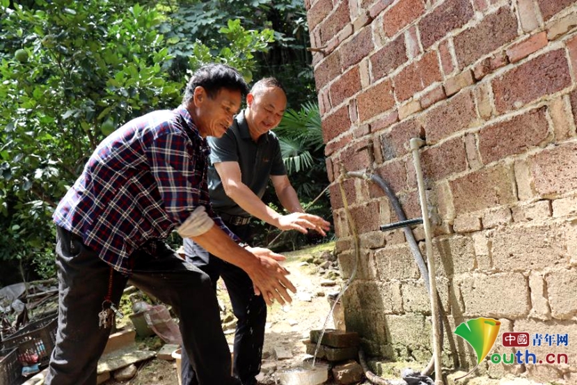 中国青年网萍乡7月10日电“辉雪,最近水压还好吗?”近日,顶着火辣辣的太阳,江西省萍乡市湘东区老关镇檀梓村党委书记朱树生来到上新田自然村五保户巫辉雪家中,拧开墙角水笼头,清亮的自来水哗哗流出。巫辉雪站在旁边“咿咿呀呀”打着手势,他大哥则立即当上哑语“翻译”:“他说现在用水很方便,还可以用这水浇上边的菜土呢!”