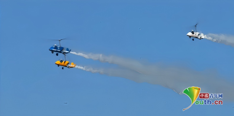 中国青年网讯10月17日,在天津直博会上空,来自郑州国家通航示范区的三架“河南造”自转旋翼机拉出3条烟带成梯形编队在空中向所有观众表示敬意,引得现场掌声、惊呼声与相机快门声汇成一片,久久不息!