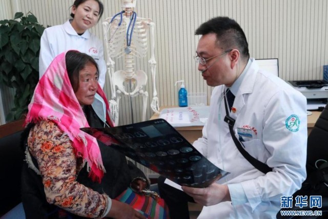 陕西省第十一批“组团式”援藏专家、西安市红会医院足踝外科副主任医师杨杰正在门诊与患者交流。新华网发