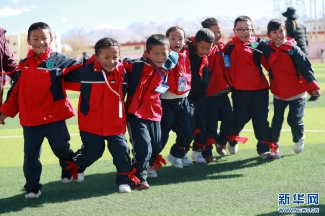 西藏阿里陕西实验学校的学生们正在操场进行趣味运动会比赛。新华网发