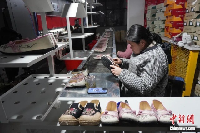 偃师制鞋工人生产绣花布鞋。韩章云 摄
