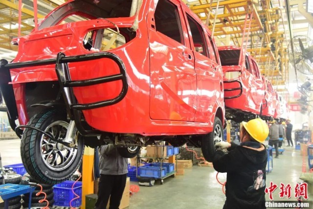 工人在生产线组装三轮摩托车。刘海洋 摄