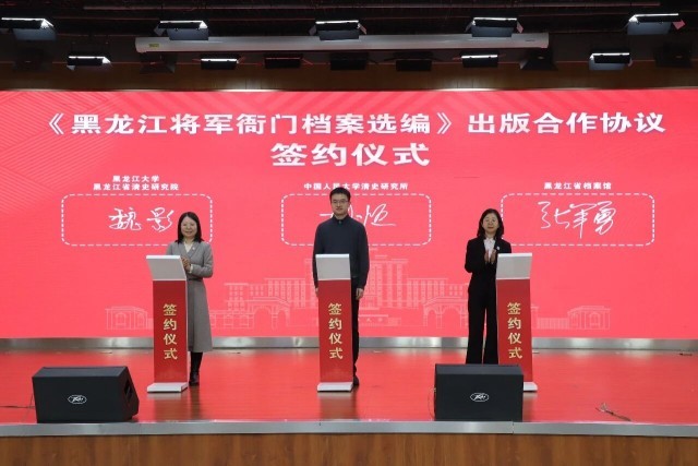 现场,黑龙江省档案馆馆长张军勇,黑龙江大学副校长、黑龙江省清史研究院院长魏影,中国人民大学清史研究所所长胡恒共同签署了《黑龙江将军衙门档案选编》出版合作协议。