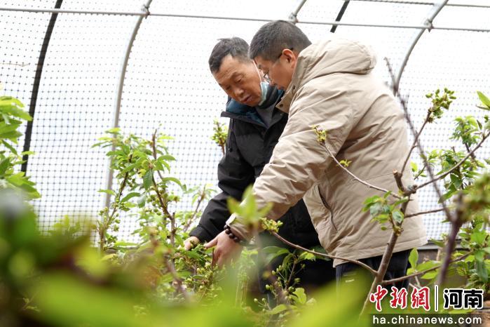 图为工作人员查看樱桃长势情况。王士豪 摄