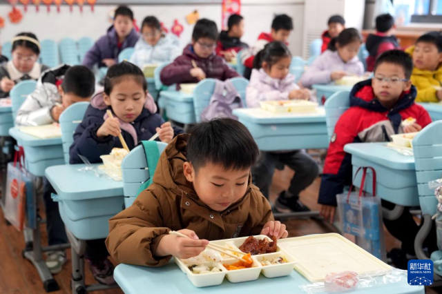 2月2日,在上海市普陀区长征镇办班点,寒托班的小学生在用午餐。