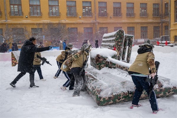 学校搭建了军营、雪道、冰场,还原抗日战争中部分作战场景。“李兆麟”冰雪练兵、“杨靖宇”辗转游击、“周保中”雪原突围、“赵尚志”雪野奇袭,将军们的英勇无畏穿透风雪岁月,在晶莹的冰雪天地间凛然矗立。