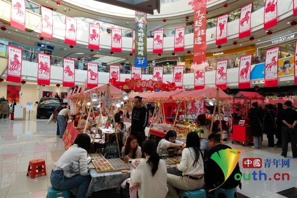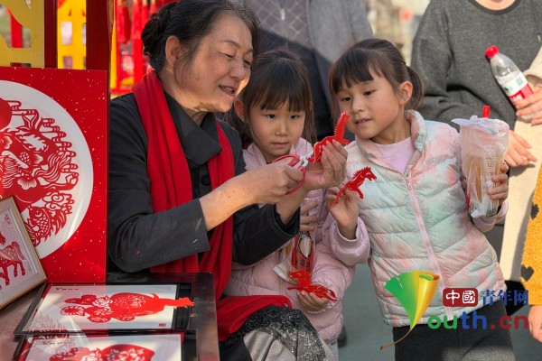 中国青年网讯(记者 蔺洁丽)腊月二十六,当秦腔的高亢唱腔在渭南老街文昌楼上响起,10岁的罗选航正手握毛笔,在红纸上写下“龙马精神”;与此同时,5公里外的高新万达广场,临渭剪纸市级非遗传承人曹静正手把手教一群年轻人用红纸剪出奔腾的骏马。
