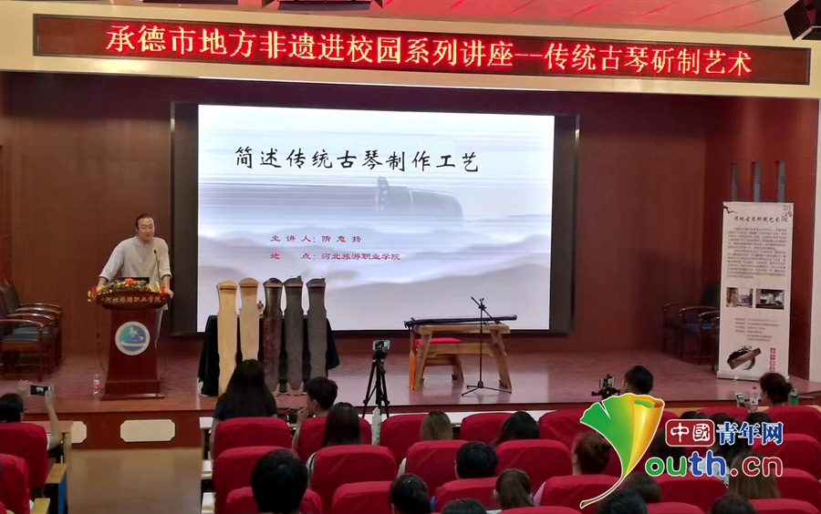 为了让年轻人了解、热爱古琴琢制技艺,隋意扬做了不少努力。比如将制琴工艺拆解开来,拍成通俗易懂的公益短片,搭配PPT图片讲解;带着不同制作阶段的古琴半成品走进课堂,让学生近距离观察、直观感受。除此之外,他还积极参与各类非遗展演活动,比如举办古琴艺术讲座,开展“非遗进校园”活动。