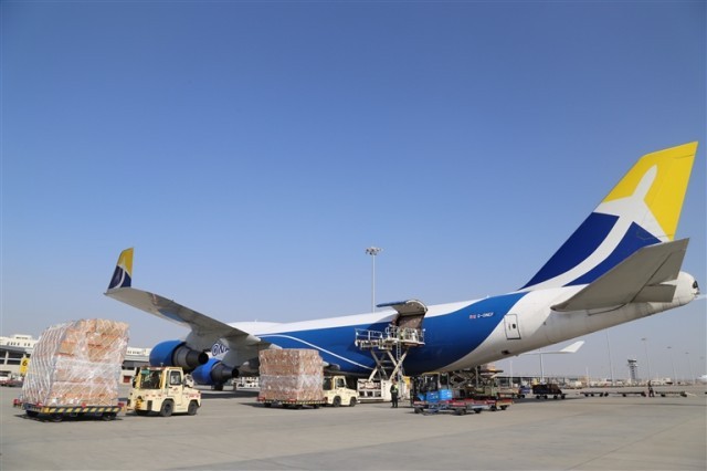 中大门国际物流“郑州—马德里”跨境电商全货机正在新郑国际机场装载货物。 受访者供图