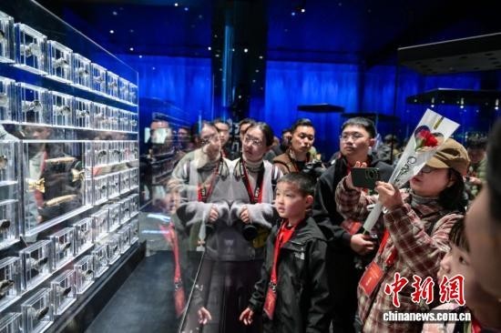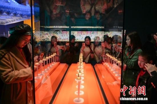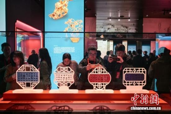 中新社记者 刘忠俊 摄 博物馆展陈的金帽顶引众多参观者拍照。