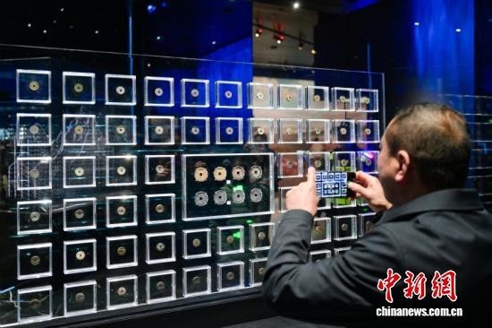 中新社记者 刘忠俊 摄 参观者手机拍摄展陈的“西王赏功”金银币。