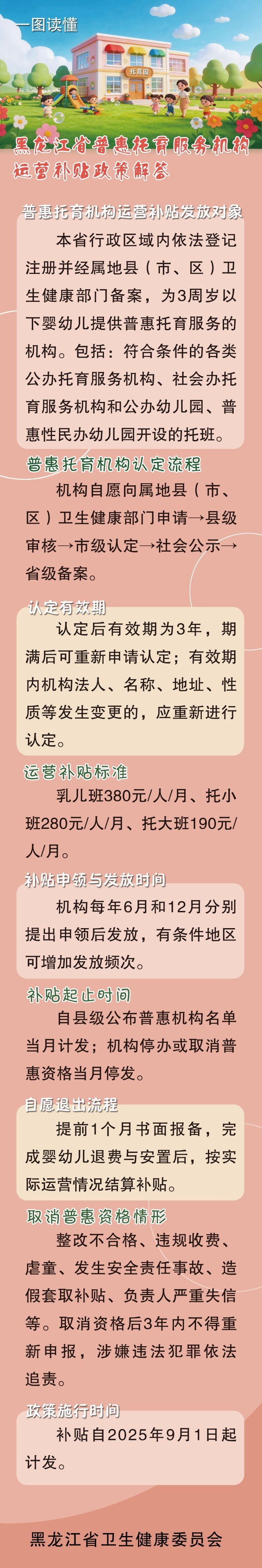 近日,黑龙江省普惠托育服务机构运营补贴政策正式落地,在落实国家育儿补贴制度的基础上,进一步出台配套举措,以“国家育儿补贴+地方托位运营补贴”的“两头补”务实办法,精准直击龙江家庭“带娃难、送托难”的民生问题,为生育家庭减负、为托育机构赋能,让“幼有所育”的民生愿景转化为实实在在的幸福体验,成为全省优化生育政策、促进人口长期均衡发展的重要支撑。