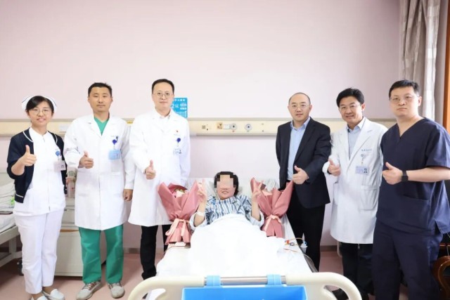 出院前夕,邰升院长、王洪亮院长和钟翔宇教授等人和患者于女士合影