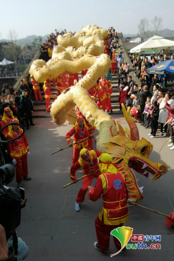 中国青年网成都2月6日电(记者 隆敏 通讯员 龚靖杰)正月初一,邛崃市平乐古镇举行舞龙等传统民俗活动,为节日增添了浓浓的年味。当天,平乐古镇的桥上人山人海,不少游客抢着在正月初一这一天踩桥祈福,希望可以在新年有个好兆头。