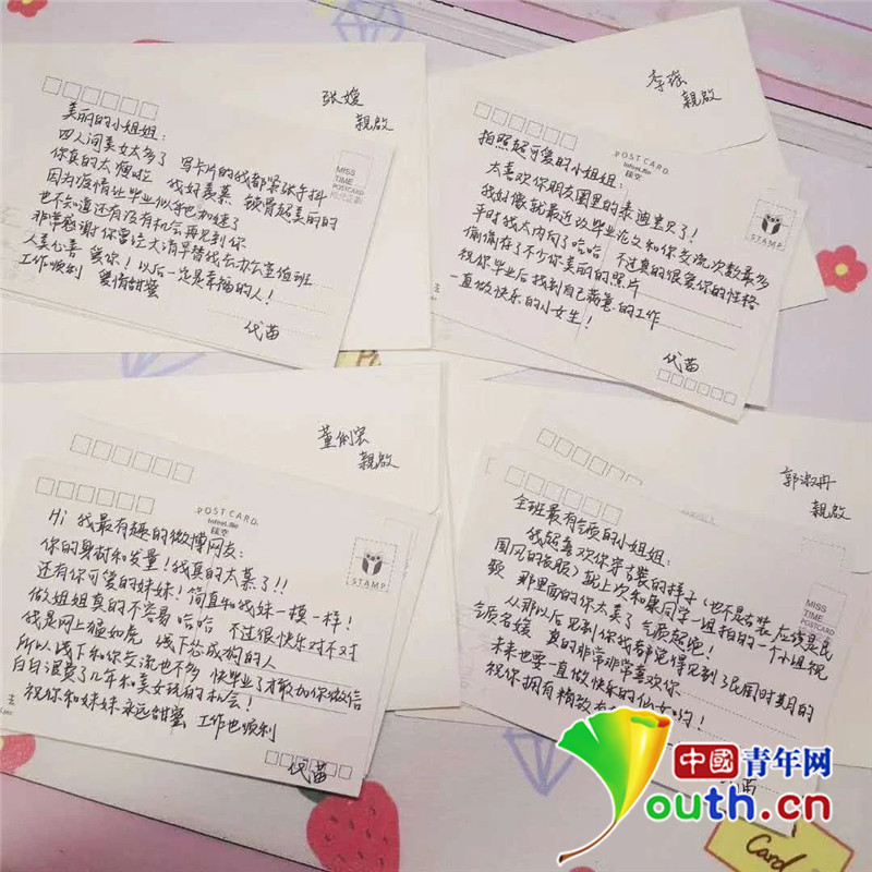 代苗说每写一张明信片,就是一次青春回忆,回忆起和同学发生的故事,回忆起同学所有的闪光点,虽然,经常写着写着都会掉眼泪,但还是无比怀念大学的时光,“有些关系比较好的同学,是真的感觉我们相见恨晚,希望毕业之后,一定不要失去联系,永远记得我们是一家人。”