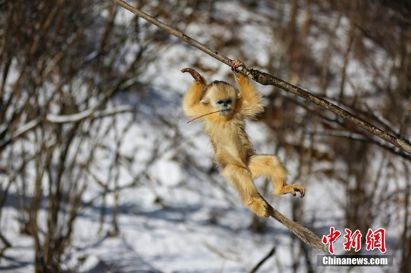 12月19日至20日,经历了一轮低温雨雪天气后,湖北神农架迎来了温暖的阳光,金丝猴纷纷嬉戏。成年金丝猴彼此梳理着金灿灿的毛发,享受着日光浴;猴宝宝们则在家长带领下或安静地进食,或在树梢上来回攀爬跳跃。神农架金丝猴属川金丝猴,是中国特有的珍稀濒危物种,也是神农架地区生物多样性保护的旗舰物种。经过多年努力,神农架金丝猴得到有效保护,种群数量已进入一个相对稳定阶段。神农架大龙潭金丝猴野外研究基每年都会出生一定数量的小金丝猴,成活率达100%。图为小金丝猴在雪地树梢攀爬跳跃。 郭裕铭 摄