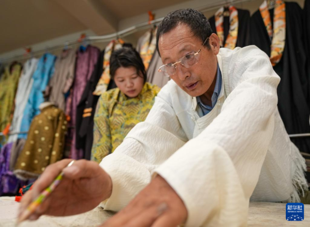 洛桑麦朗(右)在学校指导学徒裁剪布料(8月15日摄)。