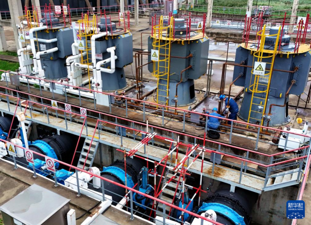 10月20日,在河南省南阳热电公司循环水主管网处,技术工人对设备进行调试、巡检(无人机照片)。