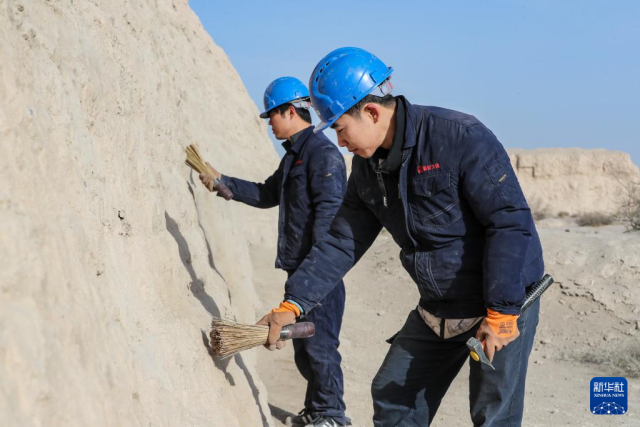 11月18日,敦煌研究院文物保护技术服务中心工作人员利用刷子对夯筑面进行修整,使其更好地与遗址墙体保持一致。