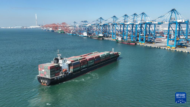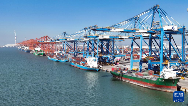 11月29日,在钦州港码头,海轮排队卸运集装箱(无人机照片)。