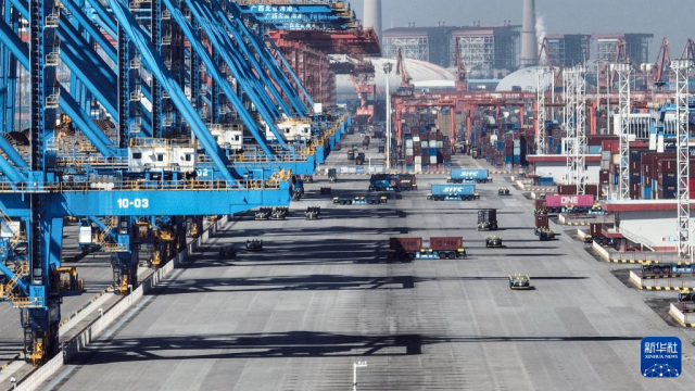 11月11日,一艘海轮在钦州港集装箱自动化码头卸货(无人机照片)。