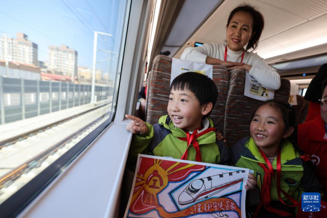 12月7日,师生代表在延安站开往西安北站的复兴号动车组列车上观赏沿途风景。