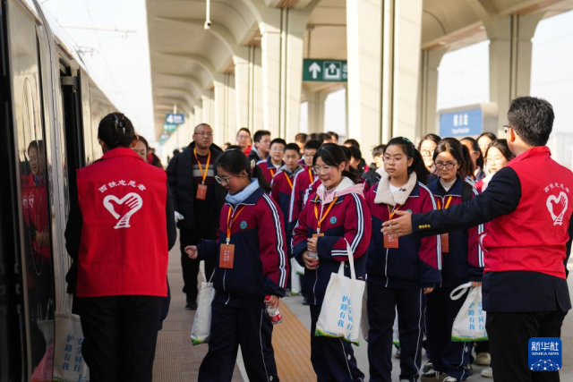 12月7日,学生代表在铜川站登乘复兴号动车组列车。
