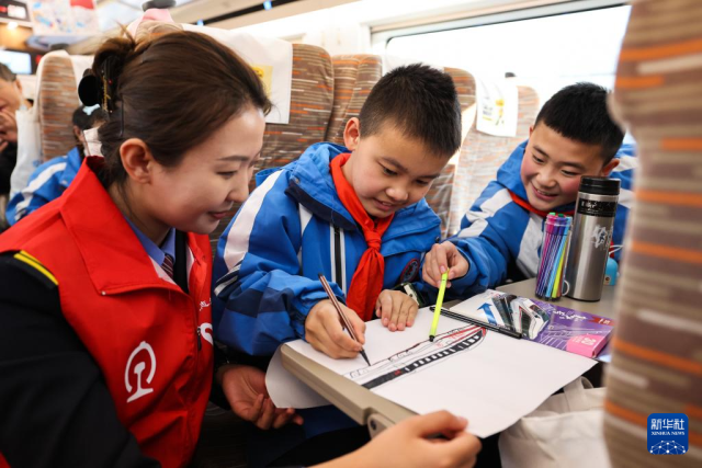 12月7日,学生代表在开往西安北站的复兴号动车组列车上进行铁路主题创意绘画。