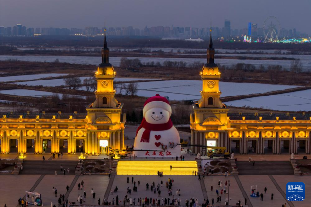 12月15日,游客在哈尔滨市群力音乐公园参观大雪人(无人机照片)。