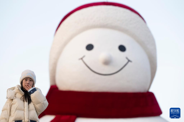 12月15日,游客在哈尔滨市群力音乐公园大雪人前合影。