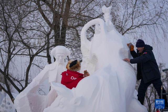 1月8日,在哈尔滨太阳岛雪博会第28届中国·哈尔滨国际雪雕比赛现场,选手进行雪雕创作。