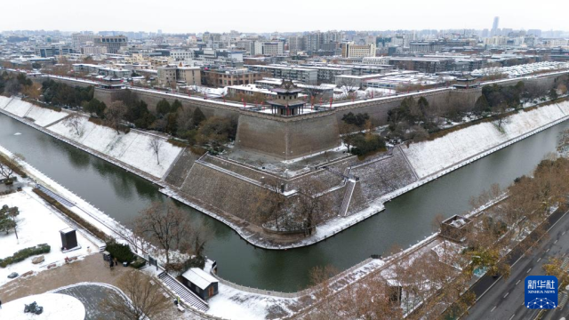 西安城墙东南角及护城河(无人机照片,1月20日摄)。