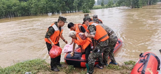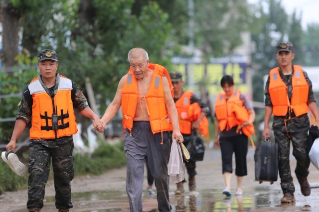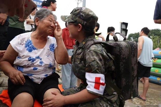 8月4日,官兵帮助老人撤离。机动支队 赵佳亮 摄