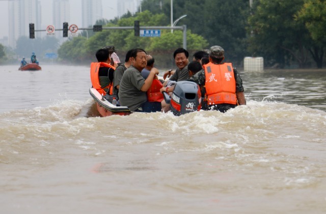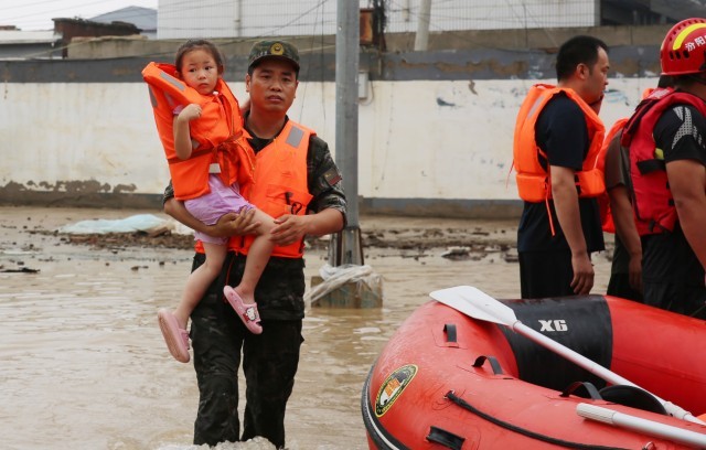 8月4日,武警官兵用冲锋舟载着群众奔赴安全地带。机动支队 江腾 摄