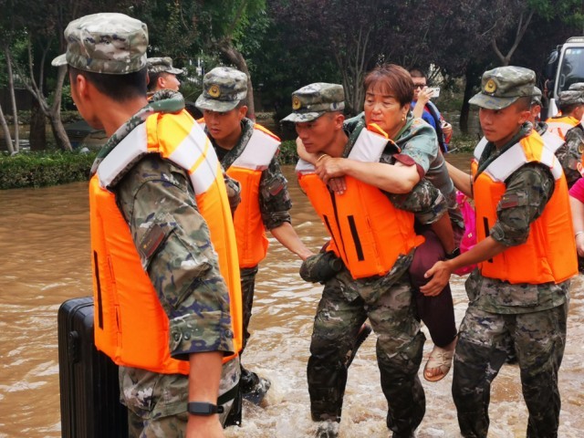 8月4日,武警官兵背着受困群众水中前行。张家口支队 刘军 摄