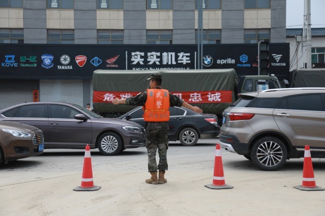 8月4日,武警官兵正在维护交通秩序。机动支队 江腾 摄