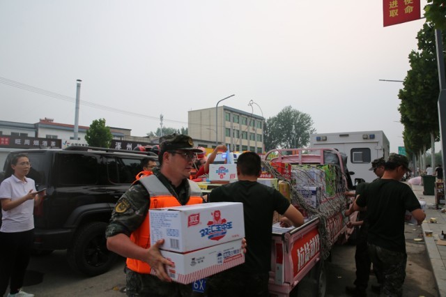 8月4日,武警官兵正在搬运救灾物资。机动支队 赵佳亮 摄