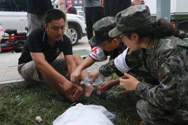 8月4日,医护人员为群众处理脚伤。武警河北总队医院 杨雪乾 摄