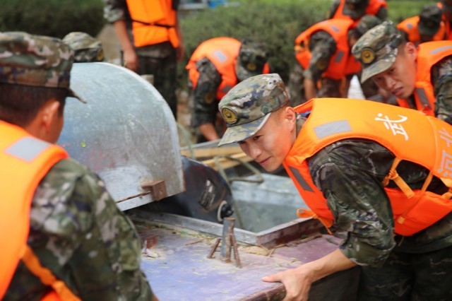 8月4日,武警官兵协助地方群众展开救援。机动支队 王岩 摄