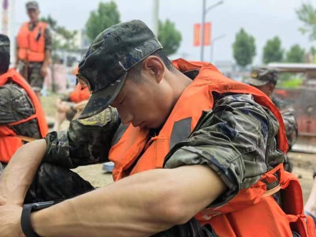 8月4日,救援官兵坐着就睡着了。保定支队 郑泽楠 摄