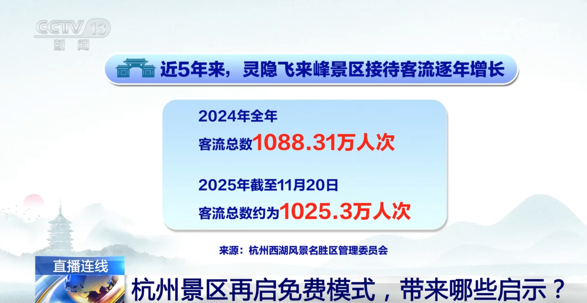 央视网消息:自12月1日起,杭州灵隐飞来峰景区实行免费政策。作为杭州西湖最受欢迎的景点之一、年客流量超千万人次,灵隐飞来峰景区为何选择在此时免票开放?从西湖到灵隐飞来峰景区,如何看待时隔20多年杭州在“免票模式”上又迈出的这一步?当景区不再依赖门票收入,又该靠什么来保持长久的吸引力?《新闻1+1》为您带来解读分析。