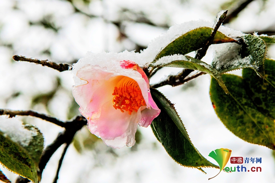 在冰雪里绽放的山茶花俏立枝头。邛崃市委宣传部供图