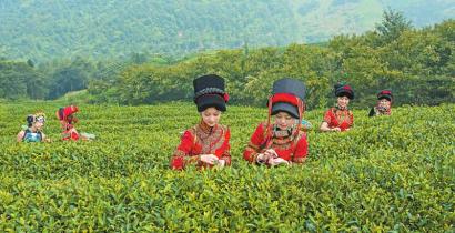 马边县劳动乡福来村,身着彝家服饰的姑娘在采摘春茶。省扶贫开发局供图